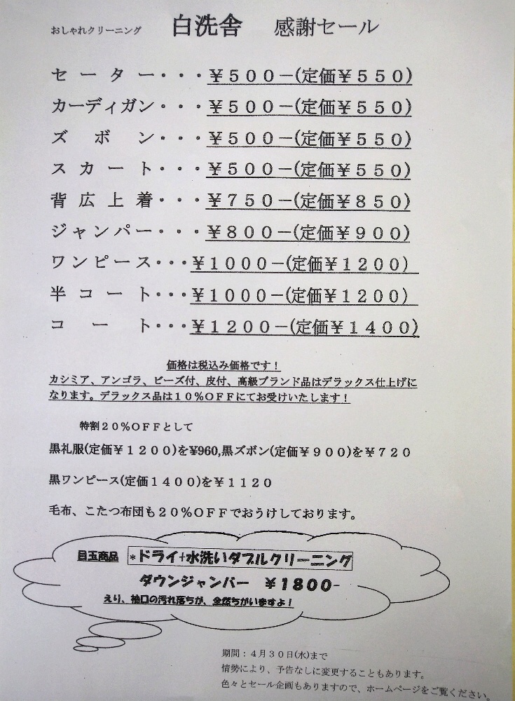 例えば、品物にもよりますが、ドライ洗いをした品物が、水洗いをしたほうがよりきれいになるような品物でしたら、追加料金なしで水洗いを施工させて頂いてきました。男子学生服や、ダウンジャンパー、作業着、夏のスラックス等、出された方々から、きれいになると、喜ばれております!